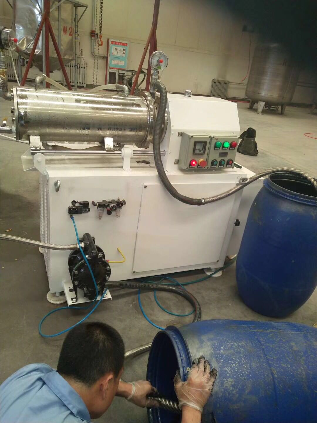 臥式砂磨機是一種廣泛用于涂料、染料、油漆、油墨、醫(yī)藥、磁臥式砂磨機粉、鐵氧體、感光膠片、農(nóng)藥、造紙以及化妝品等非金屬礦行業(yè)的濕法超微研磨分散機械。臥式砂磨機按結(jié)構(gòu)不同可分為普通臥式砂磨機,輪銷臥式砂磨機,齒盤臥式砂磨機及渦輪式臥式砂磨機。 臥式砂磨機工作連續(xù)性強,少污染,自控可靠,且成本低,結(jié)構(gòu)緊湊 1、 普通臥式砂磨機按工作筒體的有效容積分為:WS-10、WS-20、WS-30、WS-50、WS-60、WS-80、WS-100七種機型。 2、 按與物料接觸的材質(zhì)分為碳鋼和不銹鋼。 3、 按具體使用條件和要求,分防爆和普通電機共二十種機型。 是利用料泵將經(jīng)過攪拌機預(yù)分散潤濕處理后的固-液相混合物料輸入筒體內(nèi),物料和筒體內(nèi)的研磨介質(zhì)一起被高速旋轉(zhuǎn)的分散器攪動,從而使物料中的固體 微粒和研磨介質(zhì)相互間產(chǎn)生更加強烈的碰撞、摩擦、剪切作用,達(dá)到加快磨細(xì)微粒和分散聚集體的目的。研磨分散后的物料經(jīng)過動態(tài)分離器分離研磨介質(zhì),從出料管流出。臥式砂磨機特別適合分散研磨粘度高而粒度要求細(xì)的產(chǎn)品。 |